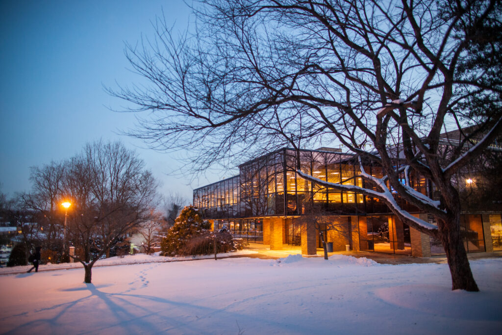Blaney Hall in the evening, snow covers the campus and lines the bare tree. Warm, orange light emanates from inside TCC