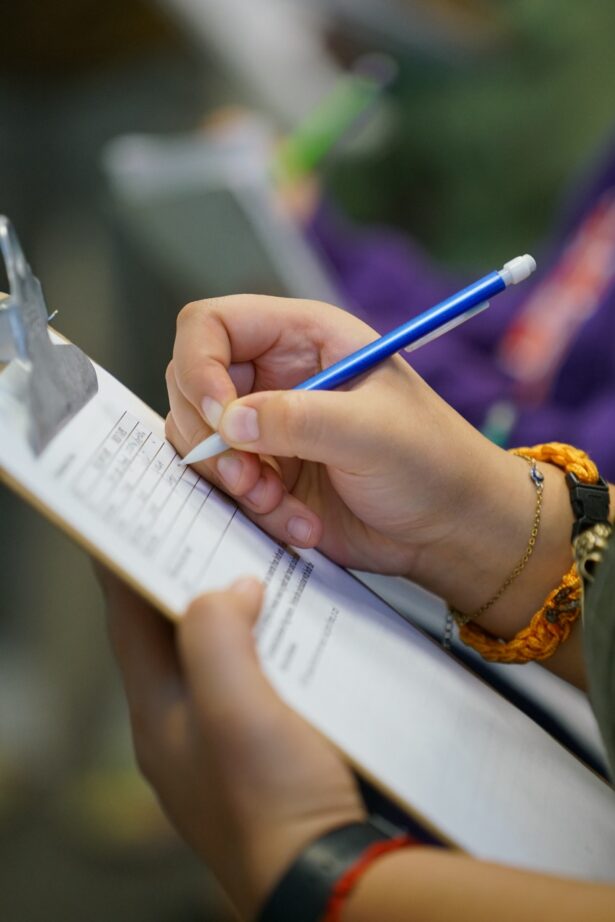 a hand holds a clipboard